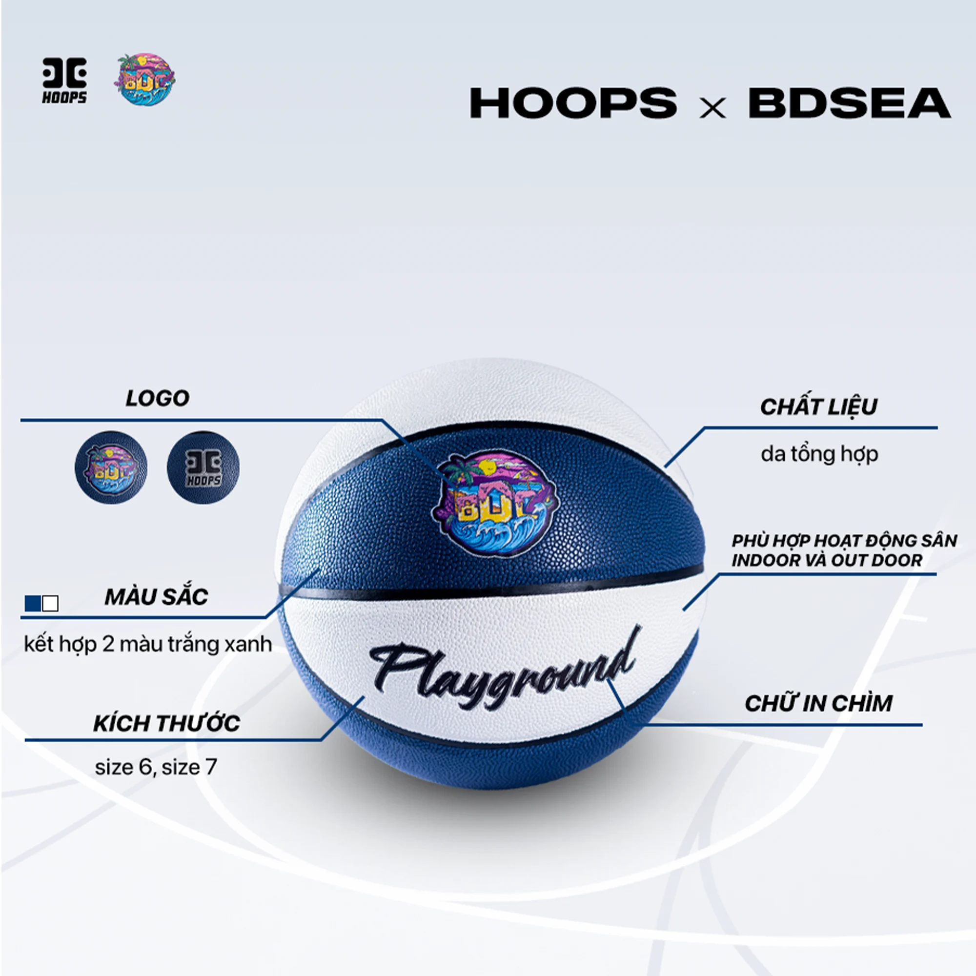 Bóng thi đấu BDSEA do thương hiệu Hoops sản xuất, có hai kích thước tiêu chuẩn (Size 6 và Size 7). Sản phẩm được làm từ da tổng hợp cao cấp, bền bỉ, bám tốt. Với họa tiết in chìm tinh tế, quả bóng mang đến sự khác biệt cả về trải nghiệm lẫn thẩm mỹ.
